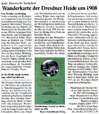 SÄCHSISCHE ZEITUNG, 13.12.2007 -Dresdner Geschichte- Historische Wanderkarte Vor rund 100 jahren brachten C.C. Meinhold einen Wegweiser durch die Heide heraus Die Dresdner Heide zog bereits um 1900 Familien und Vereine in ihren Bann. Mit der Wanderkarte des Verlages C.C. Meinhold und Söhne, herausgegeben 1908, in der Hand war es leicht, die Heide mit all ihren Schönheiten zu erkunden. Im Begleitheft zur Wanderkarte konnte man sich nicht nur über die Geschichte informieren. Der interessierte Wanderer erfuhr auch einiges über die Bedeutung der Wegezeichen. Die Wanderrouten hatten ihren Ausgangspunkt in Dresden, auf dem Weißen Hirsch, in Ullersdorf, Radeberg, Langebrück und Klotzsche-Königswald und beginnen mit der Vorbemerkung : " Alle Wege im äusseren Gefahrenbereich können nur Sonntags ohne Gefahr begangen werden". Und auch das gab es: Radfahrer waren in der Heide willkommen. |