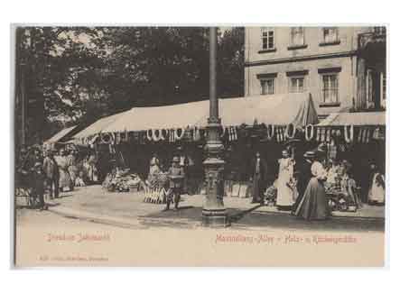 Blick in die Maximilian-Allee mit Geschäftsständen. Historische Ansichtskarte um 1905.