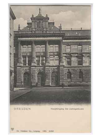 Blick zum Haupteingang des Justizgebäudes. Historische Ansichtskarte um 1905.