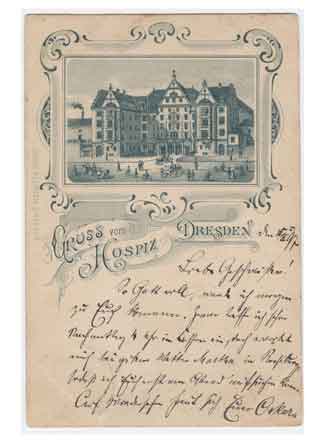 Grußkarte vom Hotel und Vereinshaus "Hospiz". Historische Ansichtskarte um 1900.