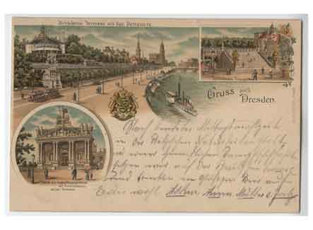 Innere Altstadt Blick zur Brühlschen Terrasse, Aufgang zur Brühlschen Terrasse und Kunstakademie. Lithographie. Historische Ansichtskarte um 1900. |