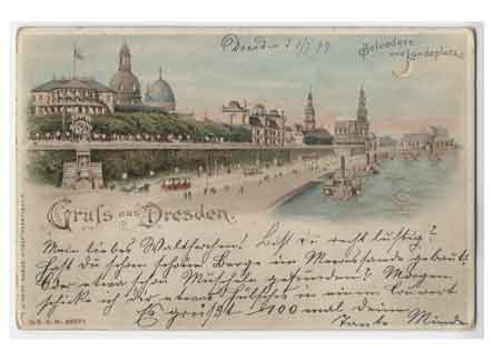 Innere Altstadt Blick zur Brühlschen Terrasse. Von links nach rechts: Bellevedere, Turm der Frauenkirche, Turm der Kunstakademie "Zitronenpresse", Kunstakademie, Schlossturm, Turm der Katholischen Hofkirche, Semperoper. Lithographie. Halt gegen das Licht Postkarte. Historische Ansichtskarte um 1900. |