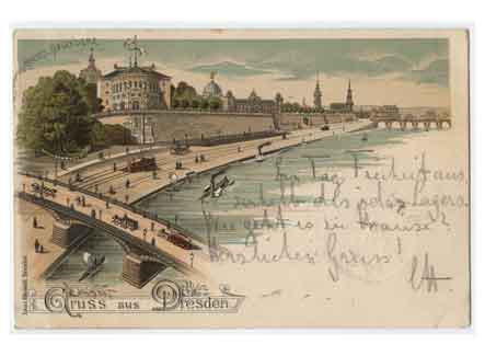 Innere Altstadt Blick über die Carolabrücke zur Brühlschen Terrasse mit dem Belleverdere. Lithographie. Historische Ansichtskarte um 1900. |