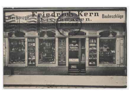 Blick auf das Eisenwarengeschäft Friedrich Kerns. Historische Ansichtskarte um 1910.
