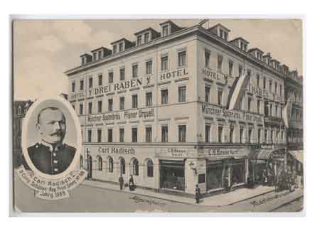 Blick auf das Hotel Drei Raben. Historische Ansichtskarte um 1910.