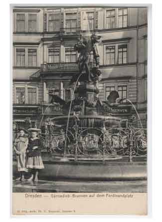 Blick auf den Gänsediebbrunnen am Ferdinandplatz. Historische Ansichtskarte um 1905.