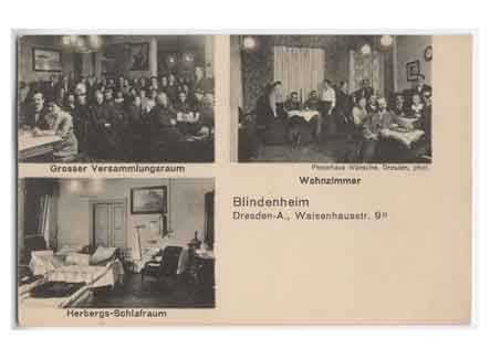 Seevorstadt Ansichtskarte vom Blindenheim in der Waisenhausstraße 9 mit dem großen Versammlungsraum, einm Schlafraum und einem Wohnzimmer. Historische Ansichtskarte um 1905. |