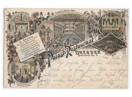 Grußkarte vom Palast-Restaurant in der Ferdinandstraße 4. Historische Ansichtskarte um 1900.
