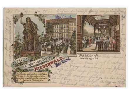 Grußkarte aus den Weinstuben Zum Niederwald von Max Grund. Historische Ansichtskarte um 1900.