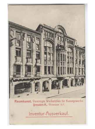 Seevorstadt Blick auf die Vereinigten Werkstätten für Kunstgewerbe und Aufruf zum Inventur-Ausverkauf. Historische Ansichtskarte um 1905. |