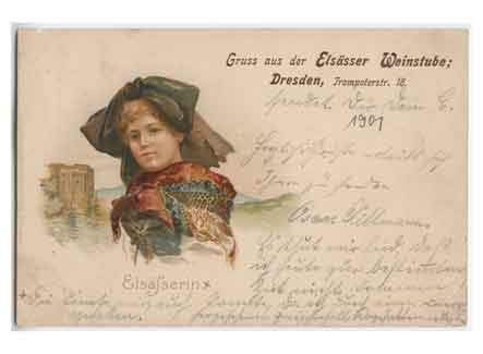 Grußkarte aus der Elsässer Weinstube in der Trompeterstraße 18. Historische Ansichtskarte um 1901.