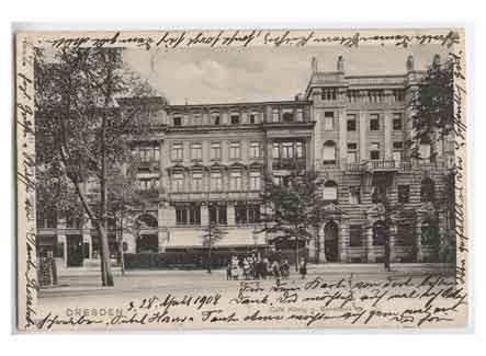 Blick auf das Café König und das Bankhaus. Historische Ansichtskarte um 1905.