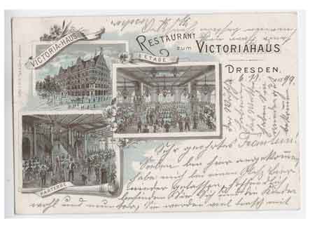 Grußkarte aus dem Restaurant zum Victoriahaus. Historische Ansichtskarte um 1900.