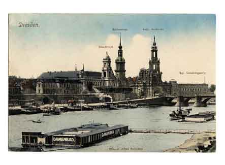 Innere Altstadt Blick über die Elbe mit Damenbad zur Altstadt mit von links nach rechts: Sekundogenitur, Ständehaus, Turm des Residenzschloss, Katholische Hofkirche. Historische Ansichtskarte um 1910. |