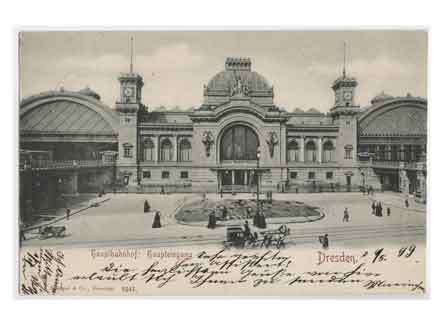 Seevorstadt Prager Straße / Hauptbahnhof Blick auf den Haupteingang des Hauptbahnhofes. Historische Ansichtskarte um 1900. |