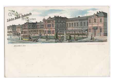 Seevorstadt Prager Straße / Hauptbahnhof Grußkarte vom Sächsisch Böhmischen Bahnhof zu Dresden. Historische Ansichtskarte um 1900. |