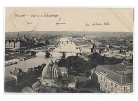 Innere Altstadt Blick von der Frauenkirche über die Carolabrücke zur Neustadt und zur Pirnaischen Vorstadt. Im Vordergrund der Turm der Kunstakademie, die "Zitronenpresse" mit der Fama, der Göttin des Ruhmes. Historische Ansichtskarte um 1910. |