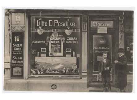 Blick auf einen Zigarettenladen. Historische Ansichtskarte um 1910.