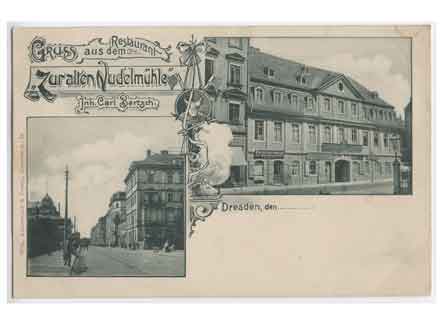 Grußkarte aus dem Restaurant Zur alten Nudelmühle. Historische Ansichtskarte um 1900.