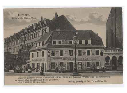 Wilsdruffer Vorstadt Blick in die Ostraallee auf das Kolonialwarengeschäft Moritz Hennig & Co. Historische Ansichtskarte um 1910. |