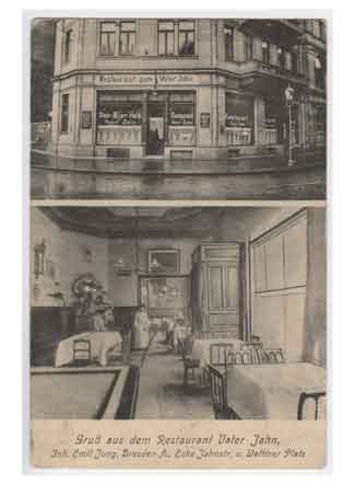 Grußkarte aus dem Restaurant Vater Jahn. Historische Ansichtskarte um 1910.