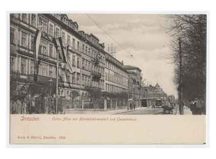 Wilsdruffer Vorstadt Blick in die Ostraallee mit der Handelslehranstalt und dem Gewerbehaus. Historische Ansichtskarte um 1905. |