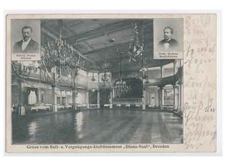 Blick in das Ball- und Vergnügungsetablissemtn "Diana-Saal". Historische Ansichtskarte um 1905.