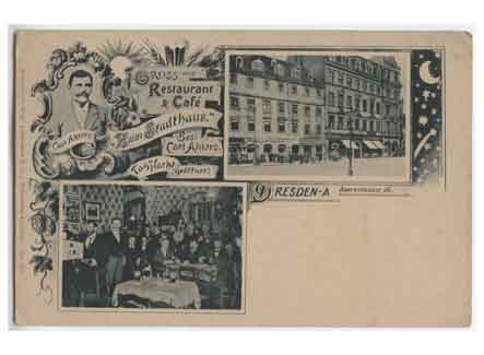 Wilsdruffer Vorstadt Grußkarte aus dem Restaurant und Café "Zum Stadthaus" in der Annenstraße 16. Historische Ansichtskarte um 1900. |
