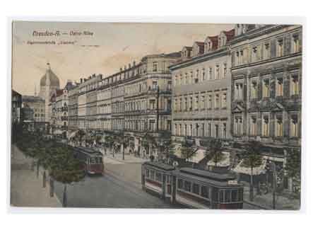 Wilsdruffer Vorstadt Blick in die Ostraallee mit der Zigarettenfabrik Yenidze im Hintergrund. Historische Ansichtskarte um 1910. |