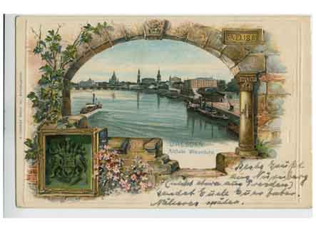 Innere Altstadt Der Malerblick von der Marienbrücke mit den Türmen des alten Dresden. Im Vordergrund links unten ?. Lithographie. Historische Ansichtskarte um 1900. |