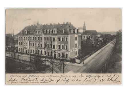 Blick auf das Pfarrhaus und die Mathäuskirche. Historische Ansichtskarte um 1905.