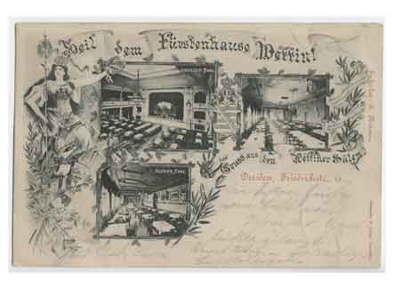 Grußkarte aus den Wettiner Sälen in der Friedrichstraße 12. Historische Ansichtskarte um 1900.