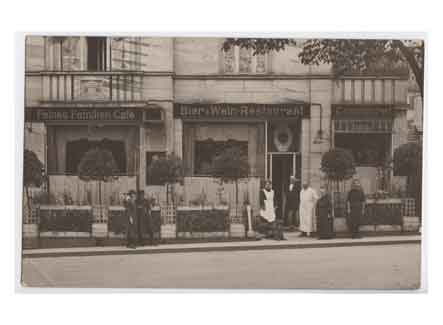 Blick auf ein Restaurant und Café. Historische Ansichtskarte um 1910.