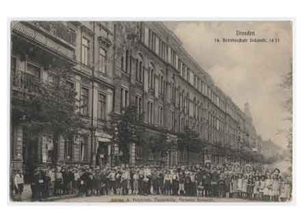 Blick in die Oppellstraße mit der 14. Bezirksschule. Historische Ansichtskarte um 1910.