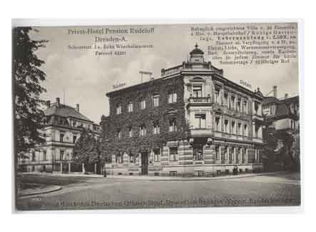 Südvorstadt Blick auf das Privat-Hotel Pension Rudeloff in der Schnorrstraße/Ecke Winckelmannstraße. Historische Ansichtskarte um 1910. |
