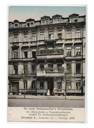 Südvorstadt Blick auf Dr. med. Nahmachers Privatklinik (für chirurgische- & Frauenkrankheiten; Anstalt für Radiumbestrahlungen) in der Sedanstraße. Historische Ansichtskarte um 1910. |