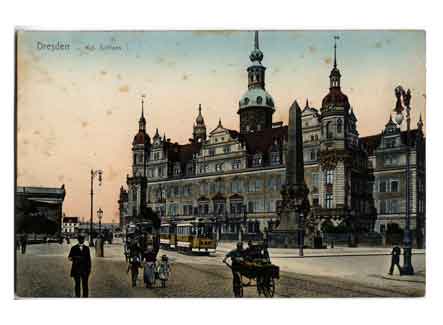Blick von der Sophienstraße zum Wettin-Obelisk und zum Residenzschloss. Historische Ansichtskarte um 1910.