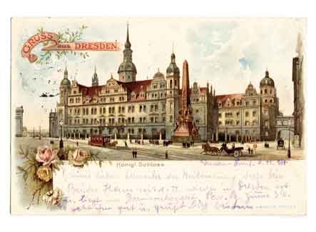 Residenzschloss Blick von der Sophienstraße zum Wettin-Obelisk und zum Residenzschloss. Lithographie. Historische Ansichtskarte um 1900. |