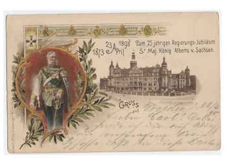 Residenzschloss König Alberts 25-jähriges Regierungsjubiläum (Regierungszeit 1873 - 1902) und Blick von der Sophienstraße zum Residenzschloss. Historische Ansichtskarte von 1898. |
