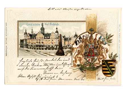 Residenzschloss Sachsenwappendarstellung ? und Blick von der Sophienstraße zum Wettin-Obelisk und Residenzschloss. Passepartoutkarte. Historische Ansichtskarte um 1900. |