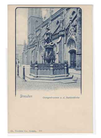Blick auf den Georgenbrunnen an der Sophienstraße (?). Historische Ansichtskarte um 1900.
