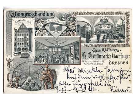 Grußkarte aus dem Wein-Restaurant in der Wilsdrufferstraße 14. Historische Ansichtskarte um 1905.