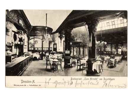Blick in das Restaurant "Zum Hirsch" am Rathaus. Historische Ansichtskarte um 1905.
