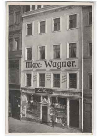 Innere Altstadt Blick auf ein Wohn- und Geschäftshaus mit dem Ladengeschäft des Max Wagners. Historische Ansichtskarte um 1910. |