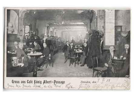 Grußkarte aus dem Café König in der Albert-Passage. Historische Ansichtskarte um 1905.
