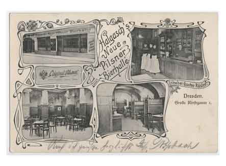 Innere Altstadt Grußkarte aus Halgaschs Neuer Pilsner Bierhalle in der Großen Kirchgasse 1. Historische Ansichtskarte um 1905. |