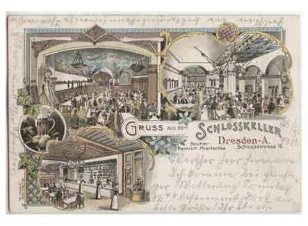 Grußkarte aus dem Schlosskeller in der Schlossstraße 16. Historische Ansichtskarte um 1905.