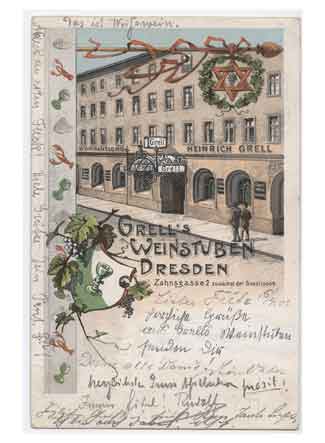 Grußkarte aus Grells Weinstuben in der Zahngasse 2 (?). Historische Ansichtskarte um 1900.