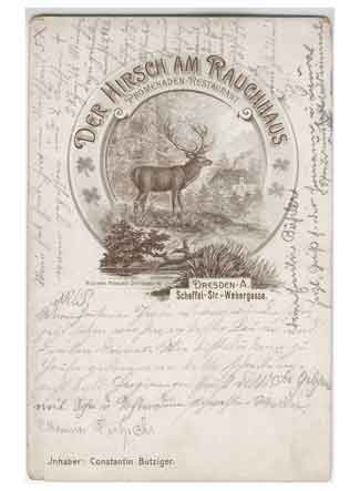 Innere Altstadt Grußkarte "Zum Hirsch" am Rauchhaus in der Scheffelstraße Ecke Webergasse (?). Historische Ansichtskarte um 1900. |