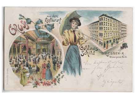 Grußkarte aus dem Restaurant Goldenes Schild in der Webergasse. Historische Ansichtskarte um 1900.
